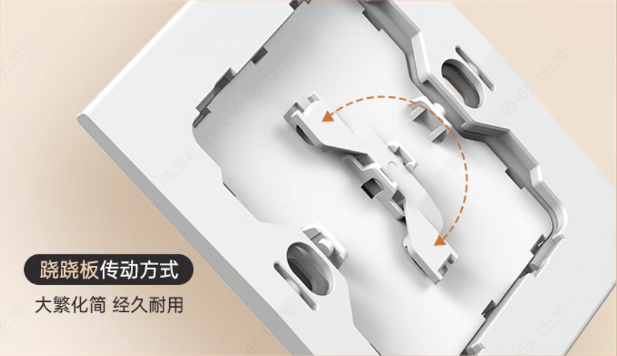 日常使用頻率很高的開關插座,細節的設計會影響使用感、體驗感,從而影響生活品質和心情。888集團X5開關創新傳動方式,“蹺蹺板”傳動化簡為繁,加持不到3°的小擺角設計,開合手感輕巧,聲音小而清脆。開/關只需輕輕一按,通過4萬次按壓檢測,經久耐用。